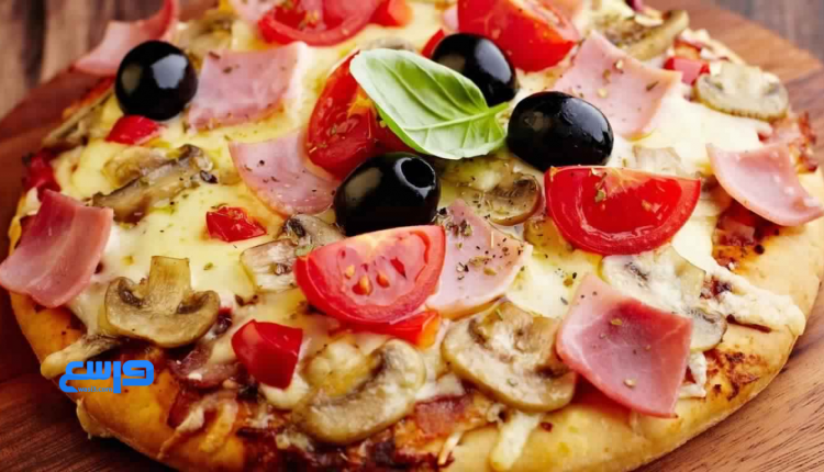 أولاً تحضر طاسة وتدهن بزيت الطعام ، ثم تحضر العجينة وتقوم بفردها بنشابة جيداً ، ثم تدهن بصلصة البيتزا ، وتوضع في الصينية ، ثم بعد ذلك تقوم بتقطيع البسطرمة واللانشون وعيش الغراب والبصلة والفلفل ، ثم يشوح في طاسة كل هذه المكونات حتى تكون نصف سوى ، ثم توضع على العجينة ، ثم بعد ذلك توضع الجبنة الموزاريلا على الوجه وتجمل بطرنشات الطماطم والفلفل الأخضر والزيتون الأسود ويكون مخلي من النوى ، ثم بعد ذلك توضع في الفرن في درجة حرارة متوسطة لكي تنضج جيداً ، ثم بعد ذلك تخرج من الفرن بعد نضجها وتقطع وترص في طبق ، ثم تقدم .